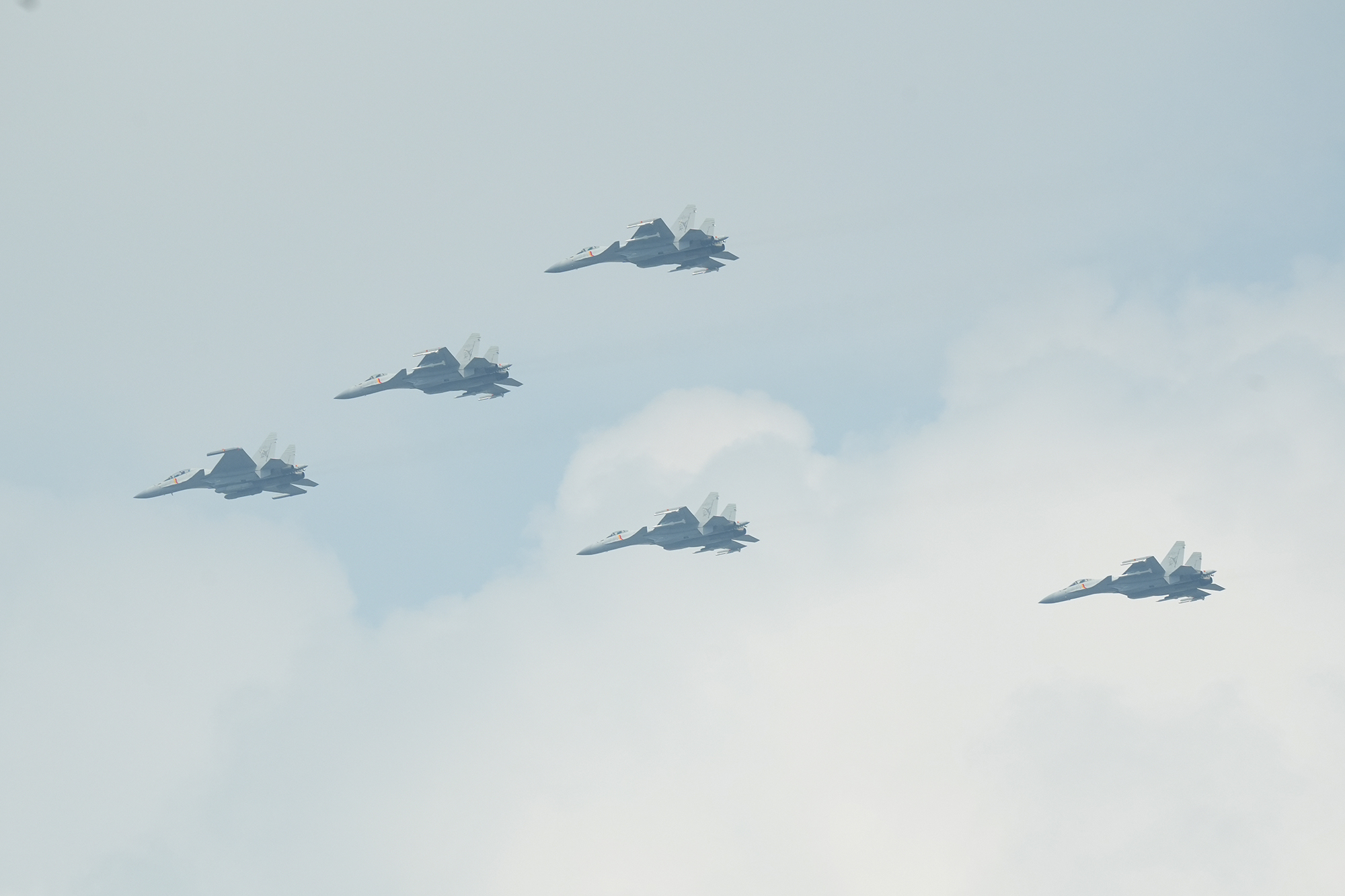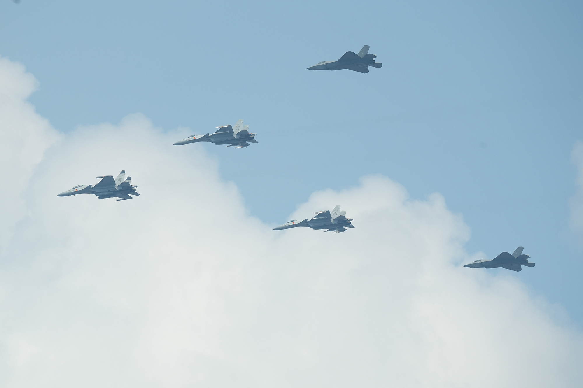 舰载机飞过天安门广场上空,全部按照实战需求多型战机混编,展示了我国空中作战装备的不断更新换代和技术进步,也展示了不同机型的密切协同,具备应对复杂战场环境的体系作战能力。摄影:郑宇航