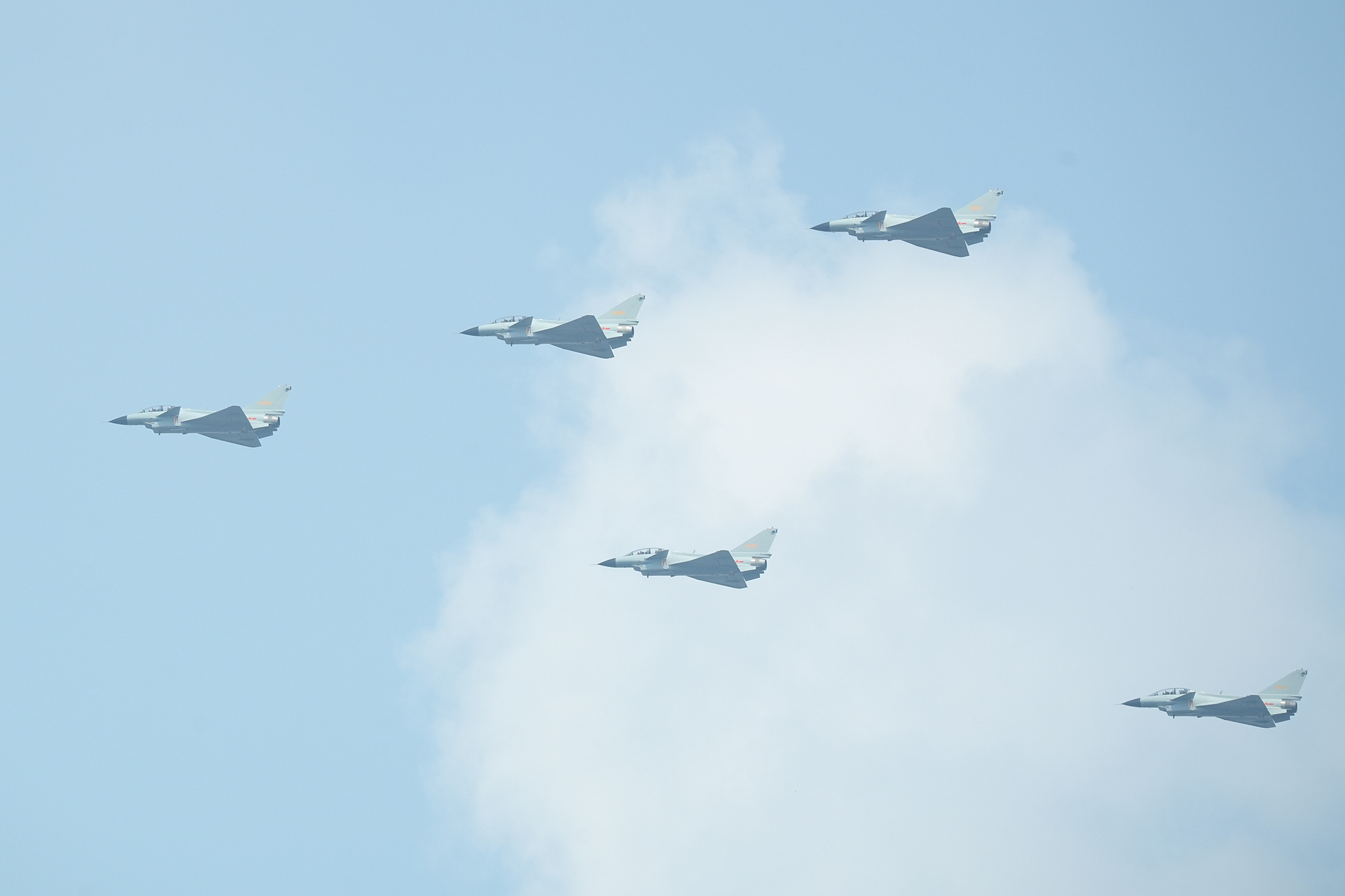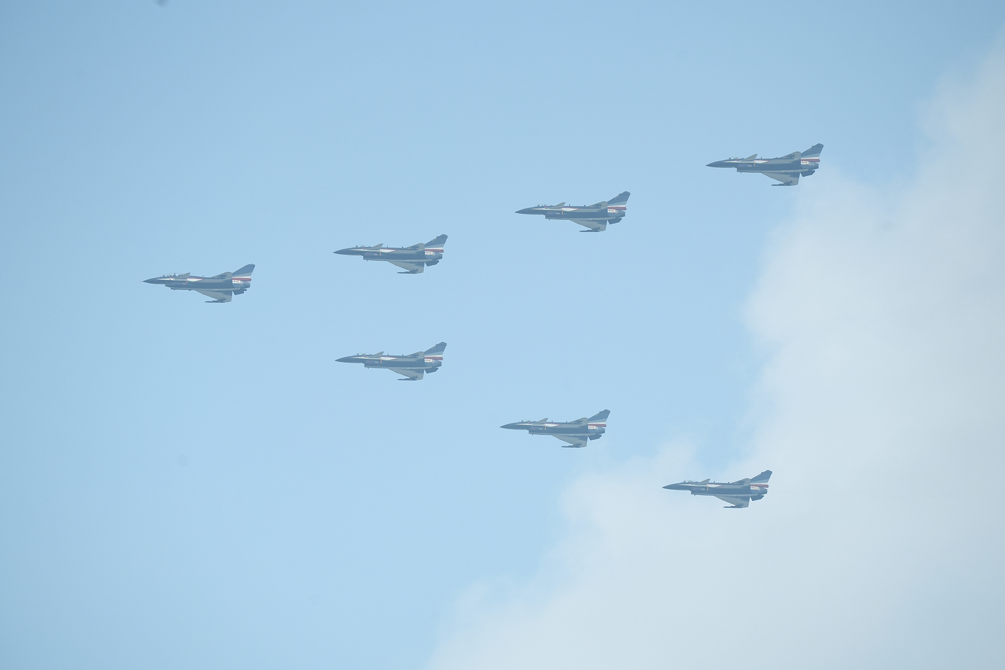 最后出场的是教练机梯队。7架歼10表演机划出14道彩烟,寓意着中华民族14年可歌可泣的抗战历程,象征着14亿中国人民奔向强国复兴的绚丽前景。摄影:郑宇航